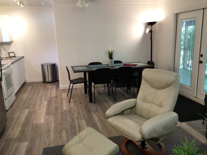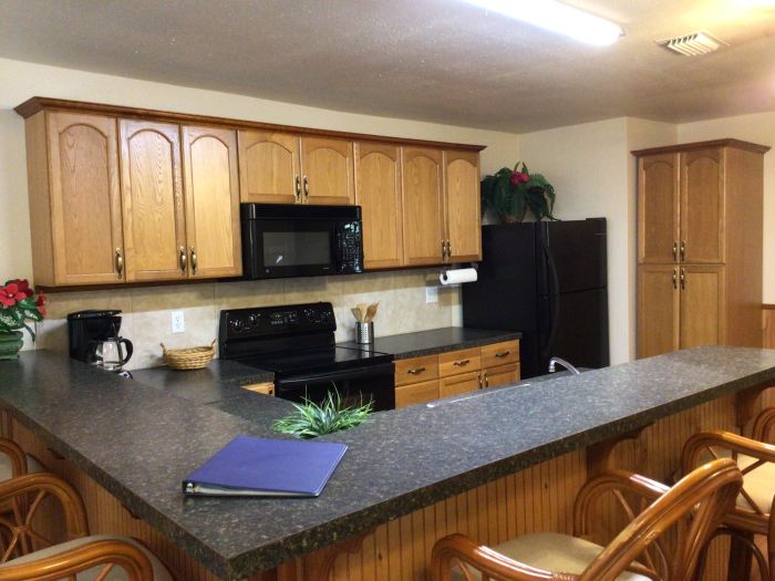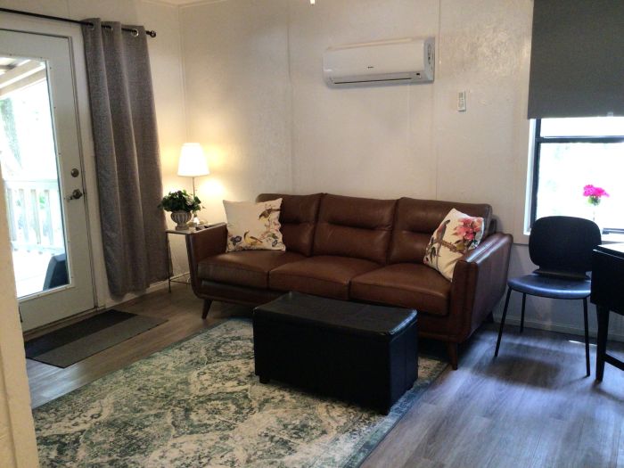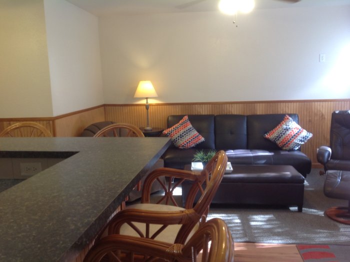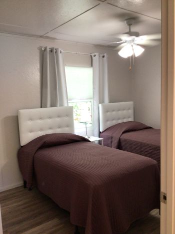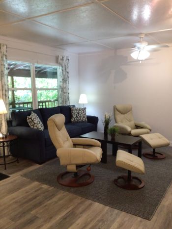 BAMBOO This beautiful cottage which was recently remodeled (2023) is located just a few steps from the pool area. It is a real beauty for sure with huge bamboos and a view of the park and pool area. Bamboo is on the second floor and has a large porch with table and chairs, perfect for relaxing with your morning coffee. On the ground level there is a picnic area with a table and charcoal grill. It also has a fire ring where you can enjoy a campfire. (See rules for firewood). The family room has a sleeper sofa, 2 swivel recliners with footstools, tables, and a large TV. One bedroom has a king bed and the other has 2 twin beds. Each bedroom has a large armoire. |